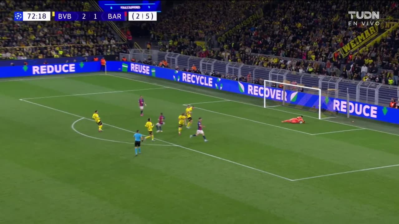 Tiro atajado junto al lado derecho de la portería. Raphinha (FC Barcelona) zurdazo desde el centro del área.