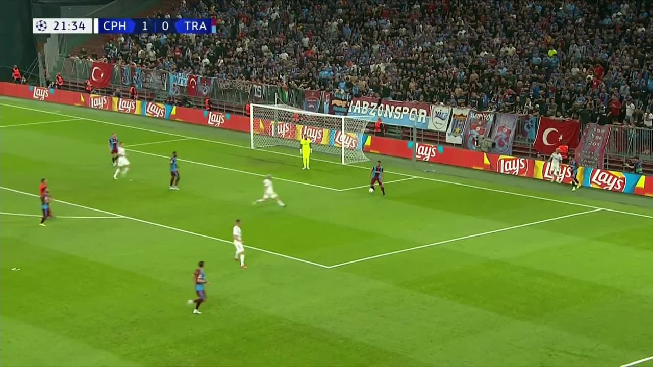 Tiro atajado raso al centro del arco. Rasmus Falk (FC København) Disparo con la derecha desde fuera del área.