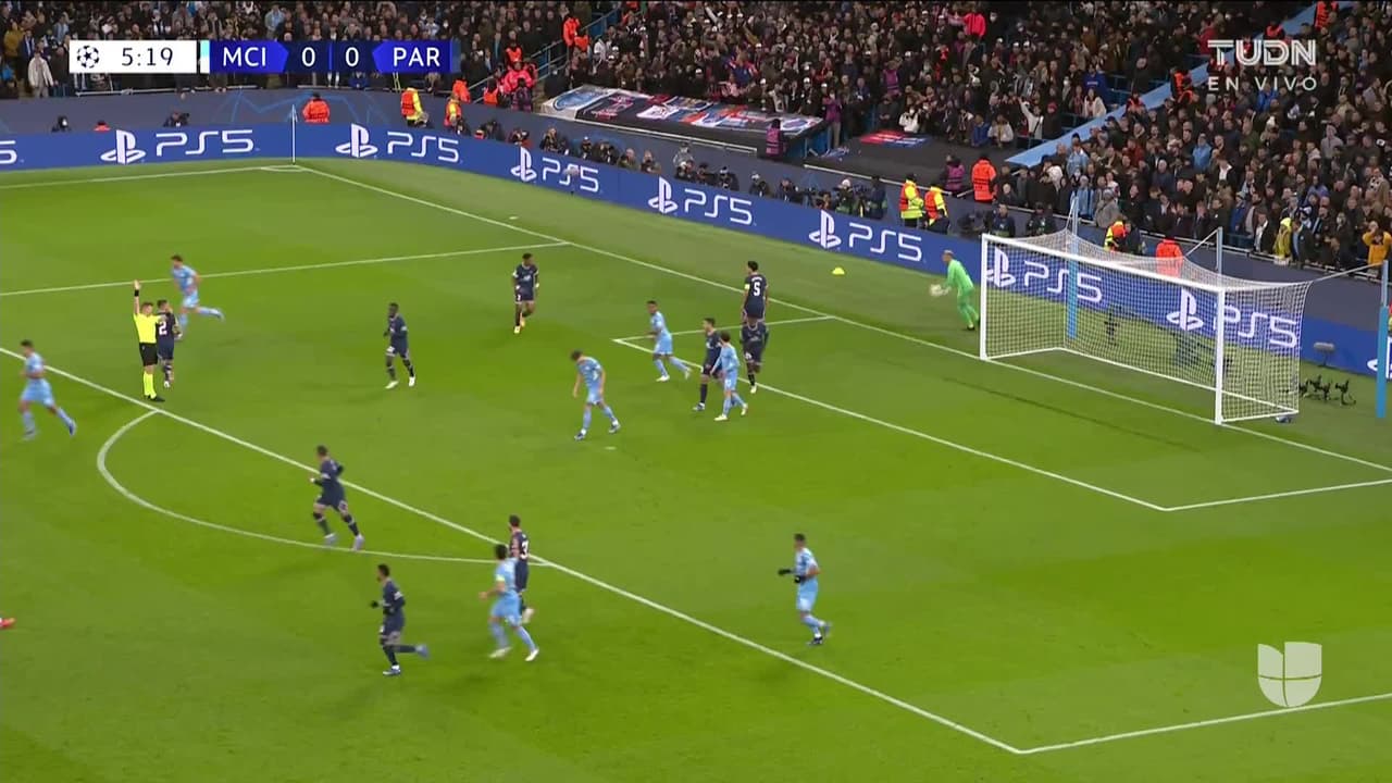 Tiro atajado. Rodri (Manchester City) disparo de cabeza desde el lado izquierdo dentro del área.