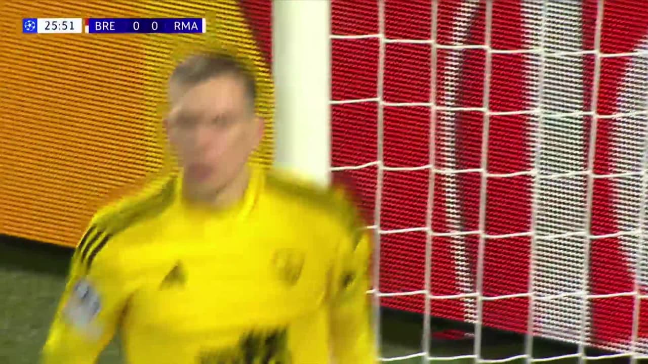 Tiro atajado por abajo a la izquierda. Rodrygo (Real Madrid) disparo de cabeza desde el centro del área. Asistencia de Lucas Vázquez con un centro al área.
