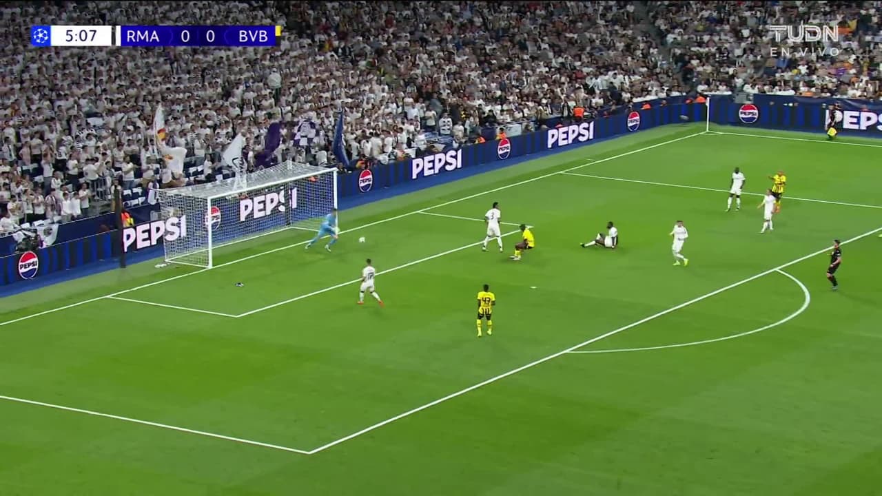 Tiro atajado Por arriba en el centro del arco. Serhou Guirassy (Borussia Dortmund) zurdazo desde el centro del área. Asistencia de Donyell Malen con un centro al área.
