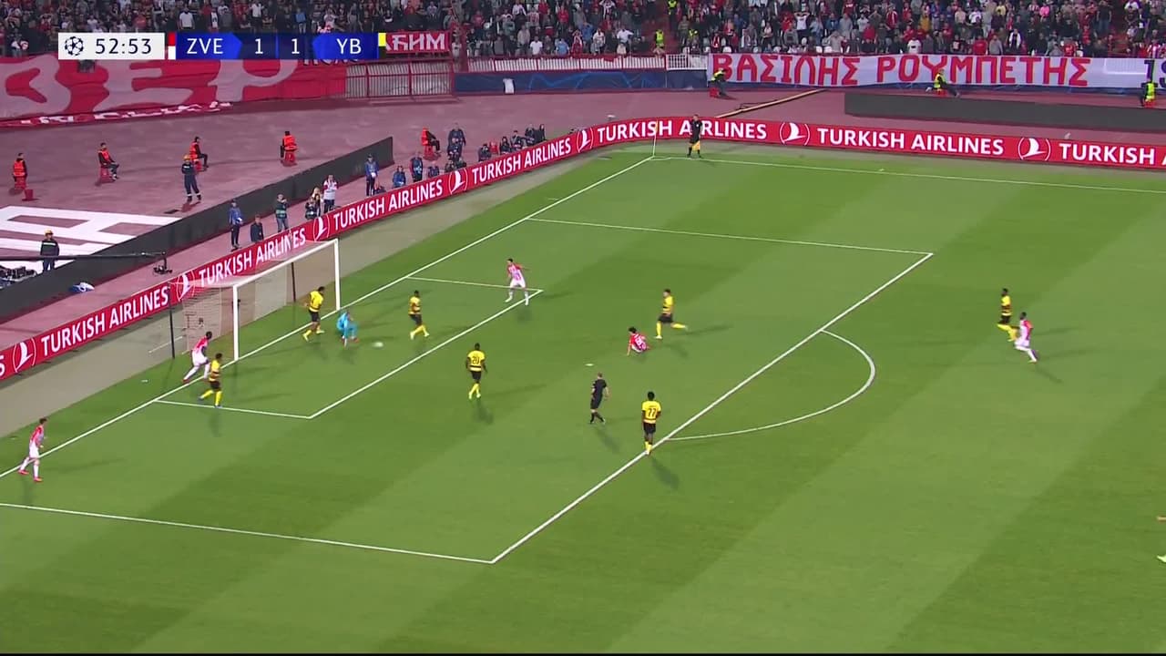 Tiro atajado por abajo a la izquierda. Stefan Mitrovic (Estrella Roja de Belgrado) zurdazo desde el lado izquierdo dentro del área. Asistencia de Hwang In-Beom.