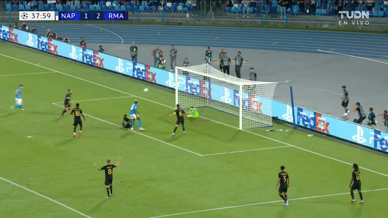 Tiro atajado por abajo a la izquierda. Victor Osimhen (Napoli) disparo de cabeza desde el centro del área. Asistencia de Matteo Politano con un centro al área.