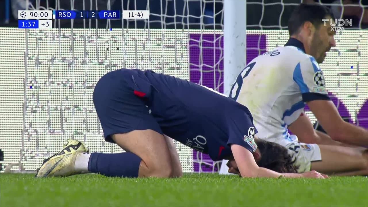 Tiro atajado por abajo a la izquierda. Vitinha (Paris Saint-Germain) Disparo con la derecha desde el lado izquierdo dentro del área. Asistencia de Kylian Mbappé.