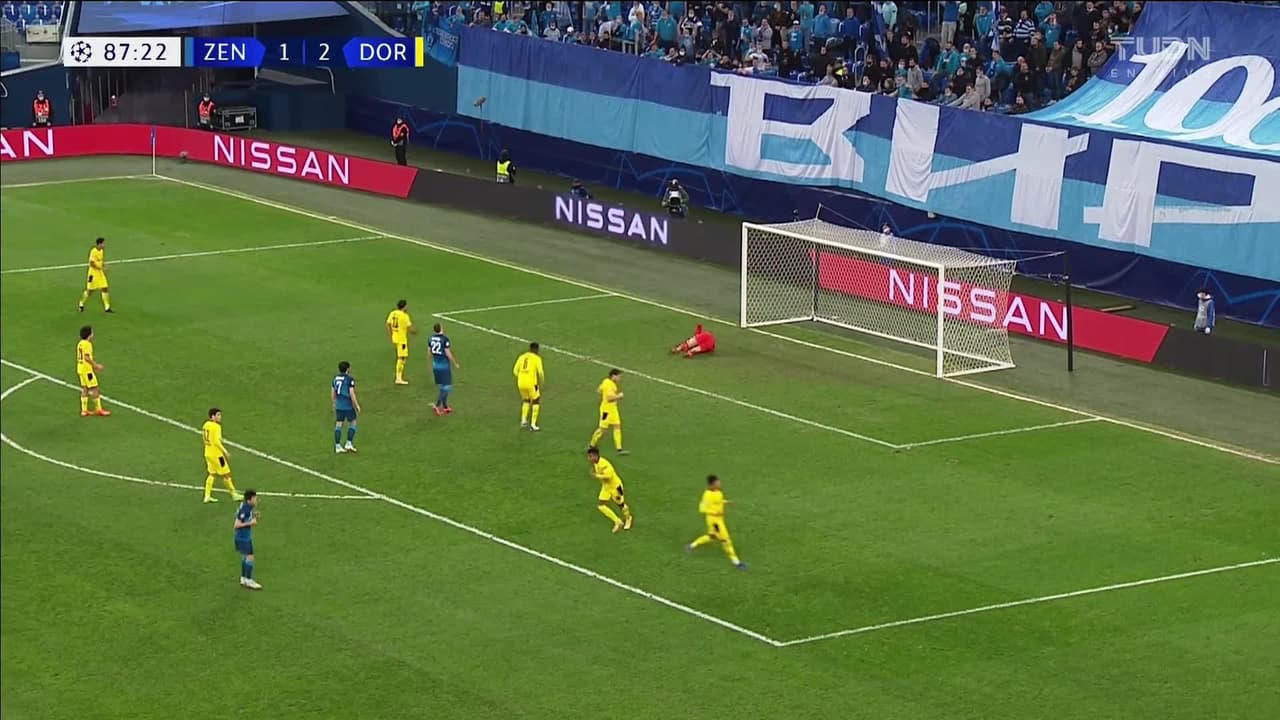 Tiro atajado. Vyacheslav Karavaev (Zenit St Petersburg) Disparo con la derecha desde fuera del área.