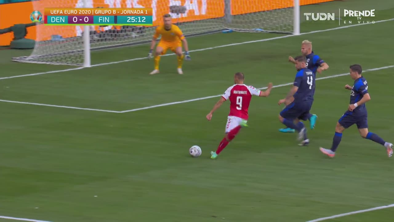 Finlandia se confía y el atacante no puede aprovechar con su zapatazo a la portería, al 26'.