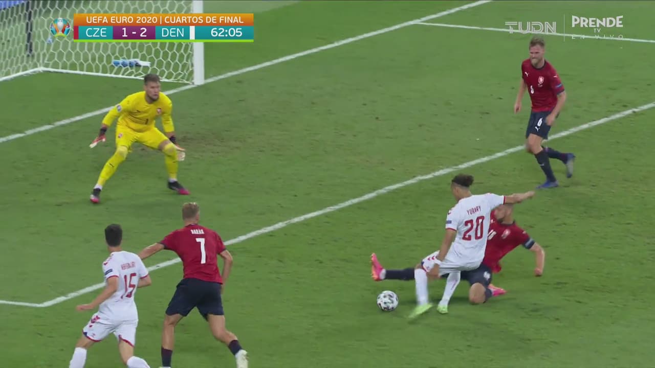 ¡Barrida salvadora! Souček tapa de último momento el tiro de Poulsen