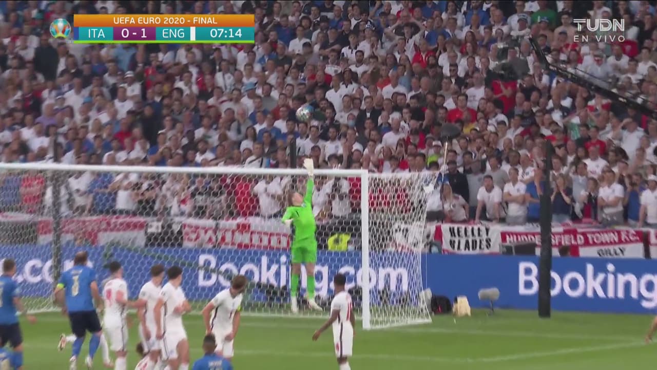 El atacante de Italia mandó un cobro potente, pero se fue por arriba del arco de Inglaterra al 7’.