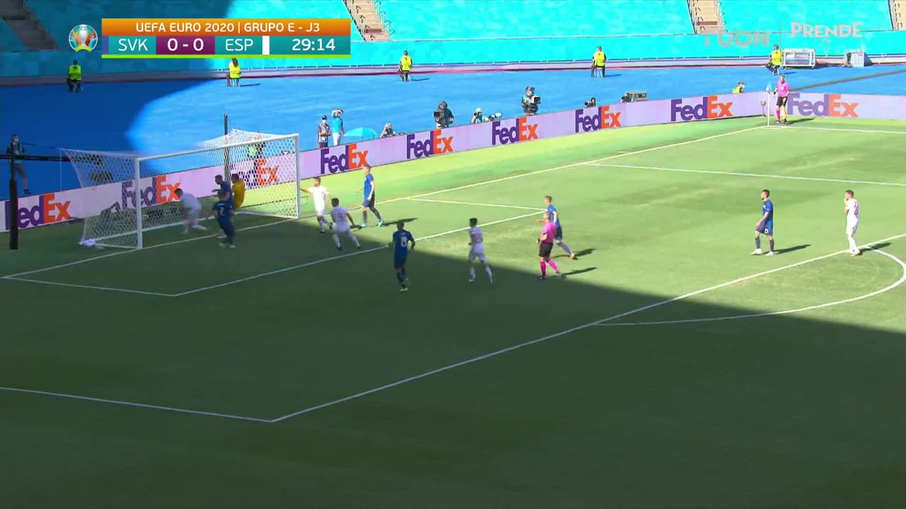 Pablo Sarabia (España) remata al travesaño| zurdazo desde fuera del área.