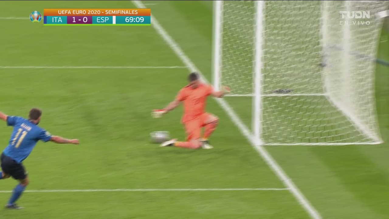 Federico hace una carrera, filtra el balón y Domenico estrella la pelota en la humanidad de Unai Simón.