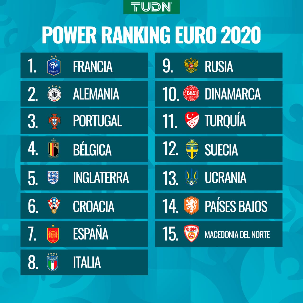 Te dejamos el Power Ranking de TUDN con la clasificación de selecciones más poderosas, aunque, recuerda, en este deporte todo puede pasar y el campeón no siempre es el favorito.