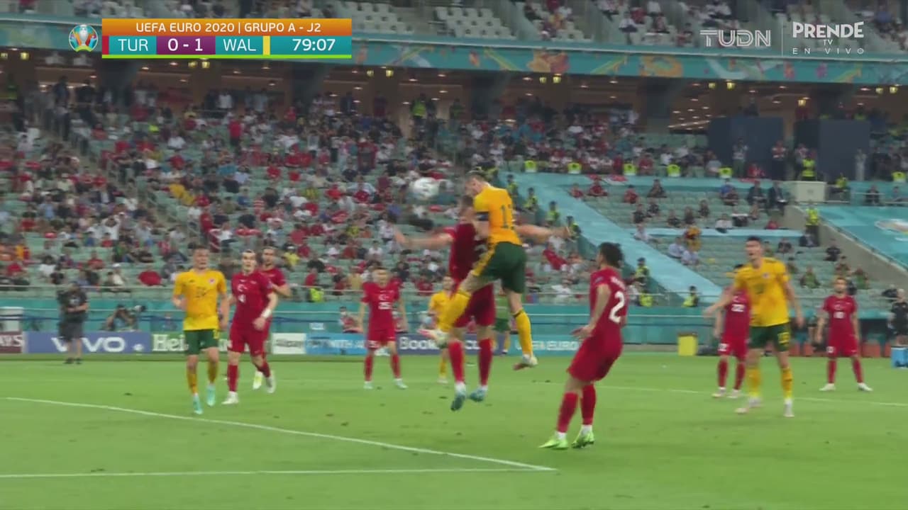 El galés le gana al defensa en el brinco, su cabezazo culmina abajo y en las manos de Çakır, al 79’.