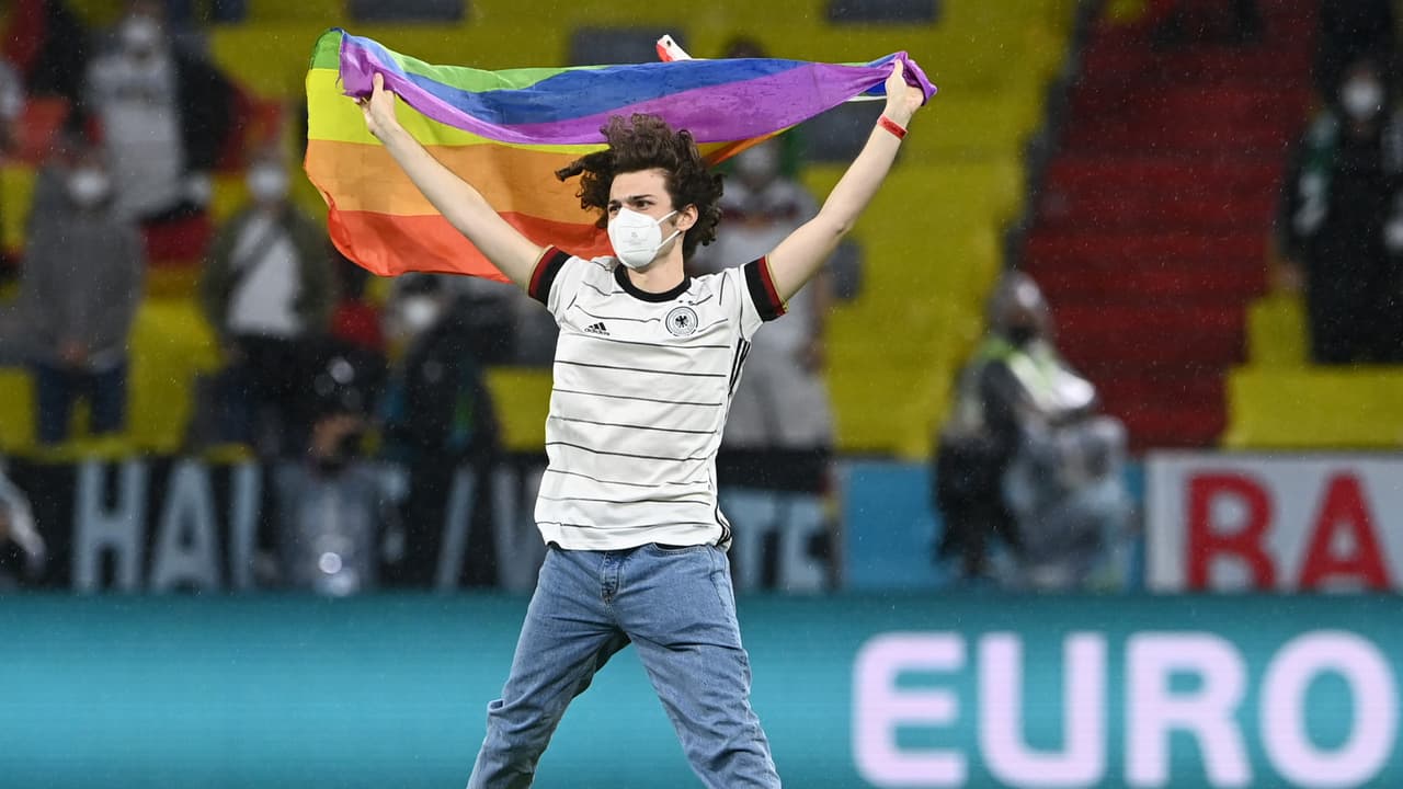 Múnich se mostró en contra del pronunciamiento de la UEFA para respetar a Hungría y no iluminar el Alianz Arena con los colores del arcoíris en el día del orgullo LGTB+, pero un espontáneo se metió al campo para ondear los colores del arcoiris previo al inicio del encuentro entre Alemania y Hungría.