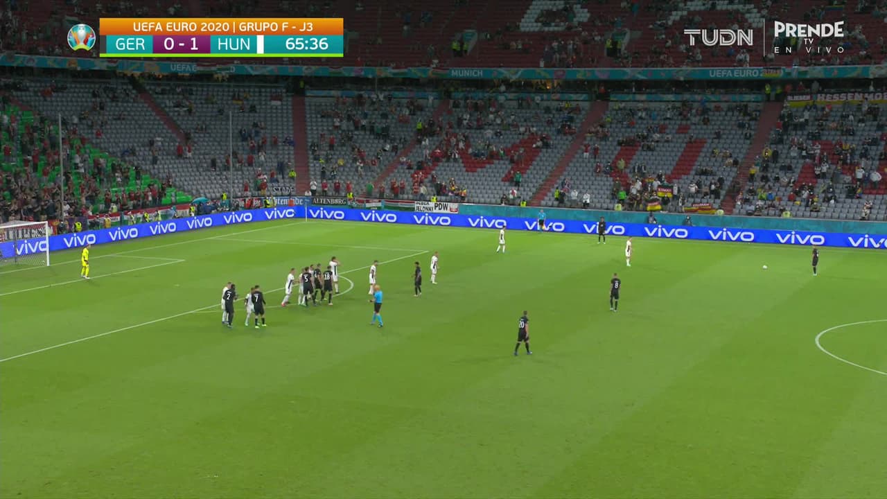 ¡Gol! Alemania 1| Hungría 1. Kai Havertz (Alemania) disparo de cabeza desde muy cerca tras el cobro de una falta.