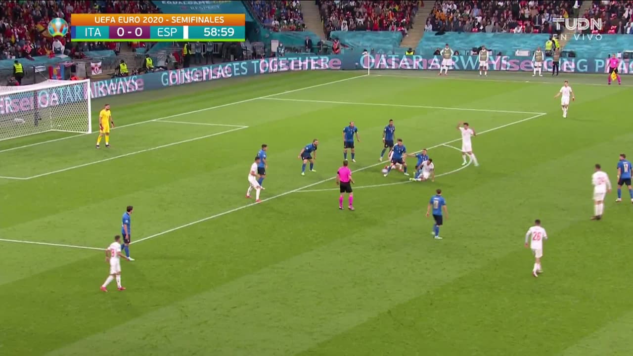¡Gol! Italia 1| España 0. Federico Chiesa (Italia) Disparo con la derecha desde el lado izquierdo dentro del área por el lado derecho de la portería. Asistencia de Ciro Immobile.