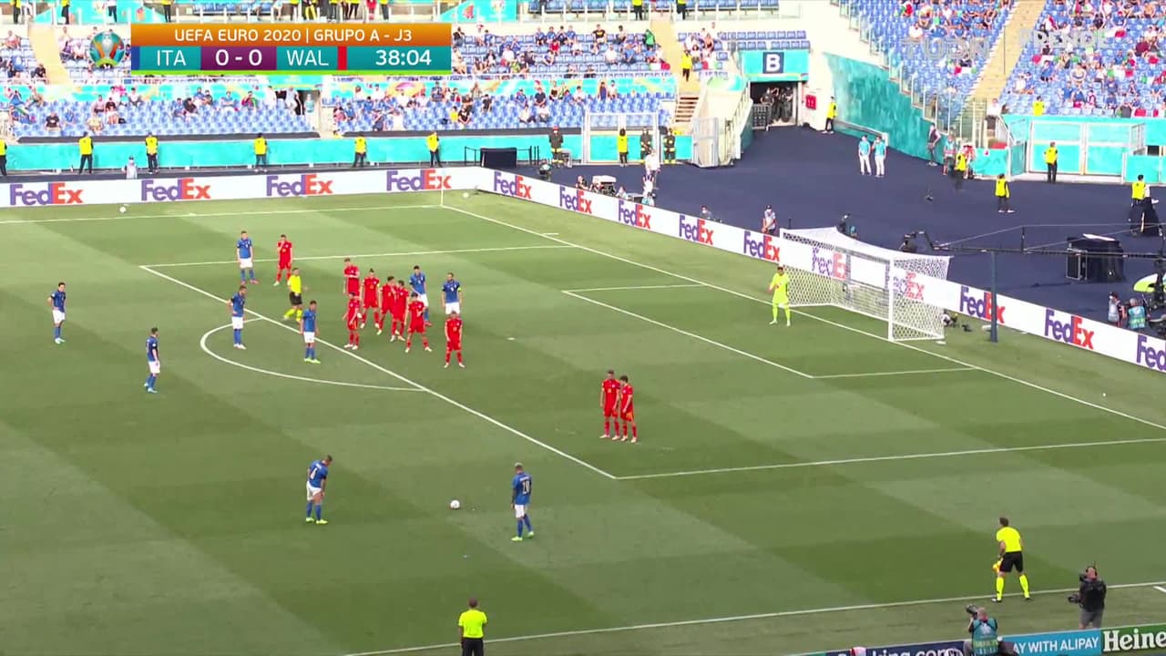 ¡Gol! Italia 1| Gales 0. Matteo Pessina (Italia) Disparo con la derecha desde el centro del área tras el cobro de una falta.