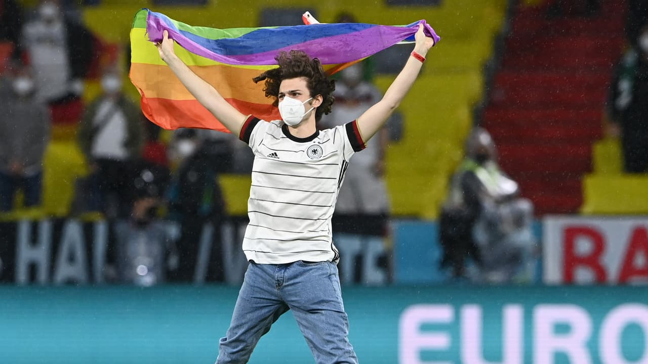 Invade aficionado con bandera en apoyo a LGBT el Alemania-Hungría