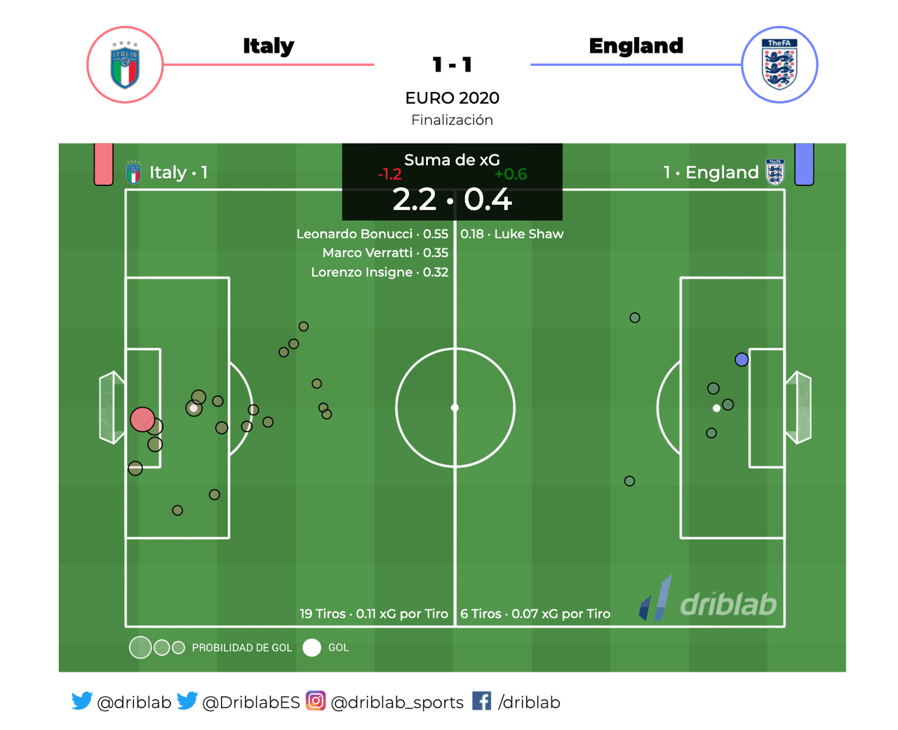 El repliegue inglés permitió a Italia tener el balón y avanzar muchos metros hacia el arco rival, era cuestión de tiempo para el empate, Pickford salvó dos ocasiones, pero en un tiro de esquina llegó el error y Bonucci anotó.