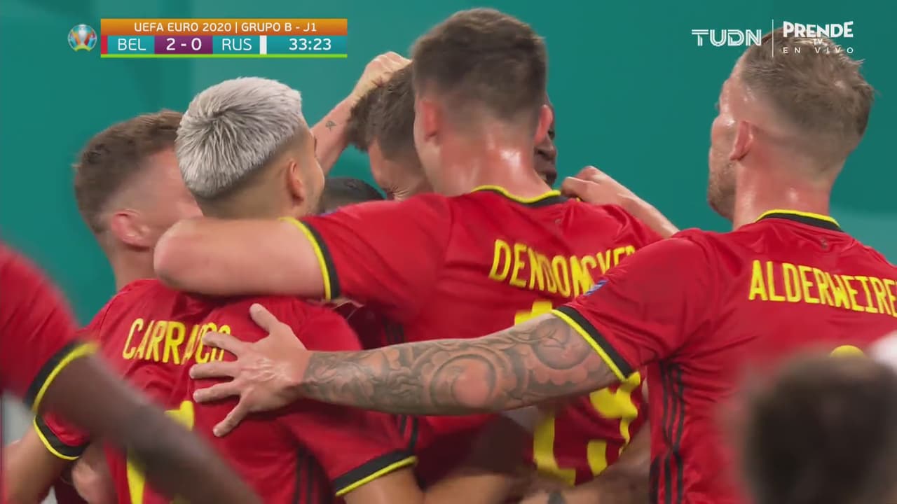 El lateral aprovecha un rebote del portero y con arco a disposición anota para Bélgica, al 33'. (editado)