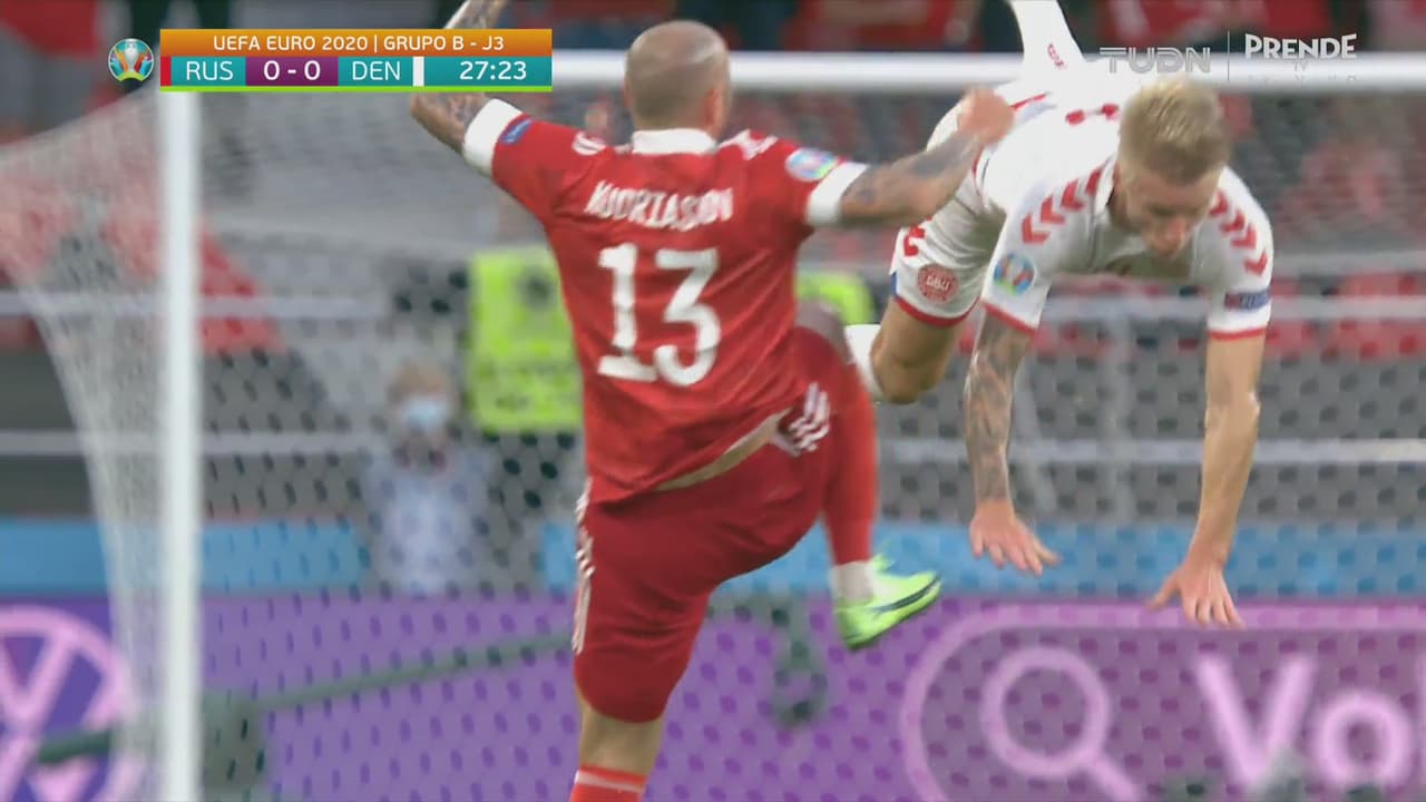 Los dos fueron a buscar el balón por aire, pero el de Rusia metió el brazo y se ganó la tarjeta amarilla.