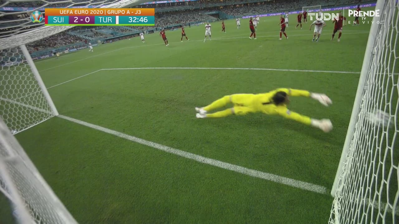 El lateral de Turquía se volvió a agregar al ataque, tomó el balón de volea, pero el arquero manoteó al 33’.