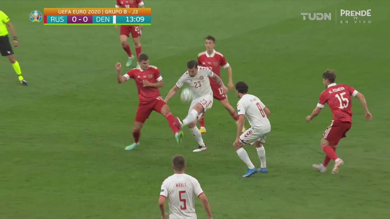 El jugador de Rusia le dejó la pierna muy arriba a Pierre-Emile Hojbjerg, pero el árbitro sólo marcó falta.