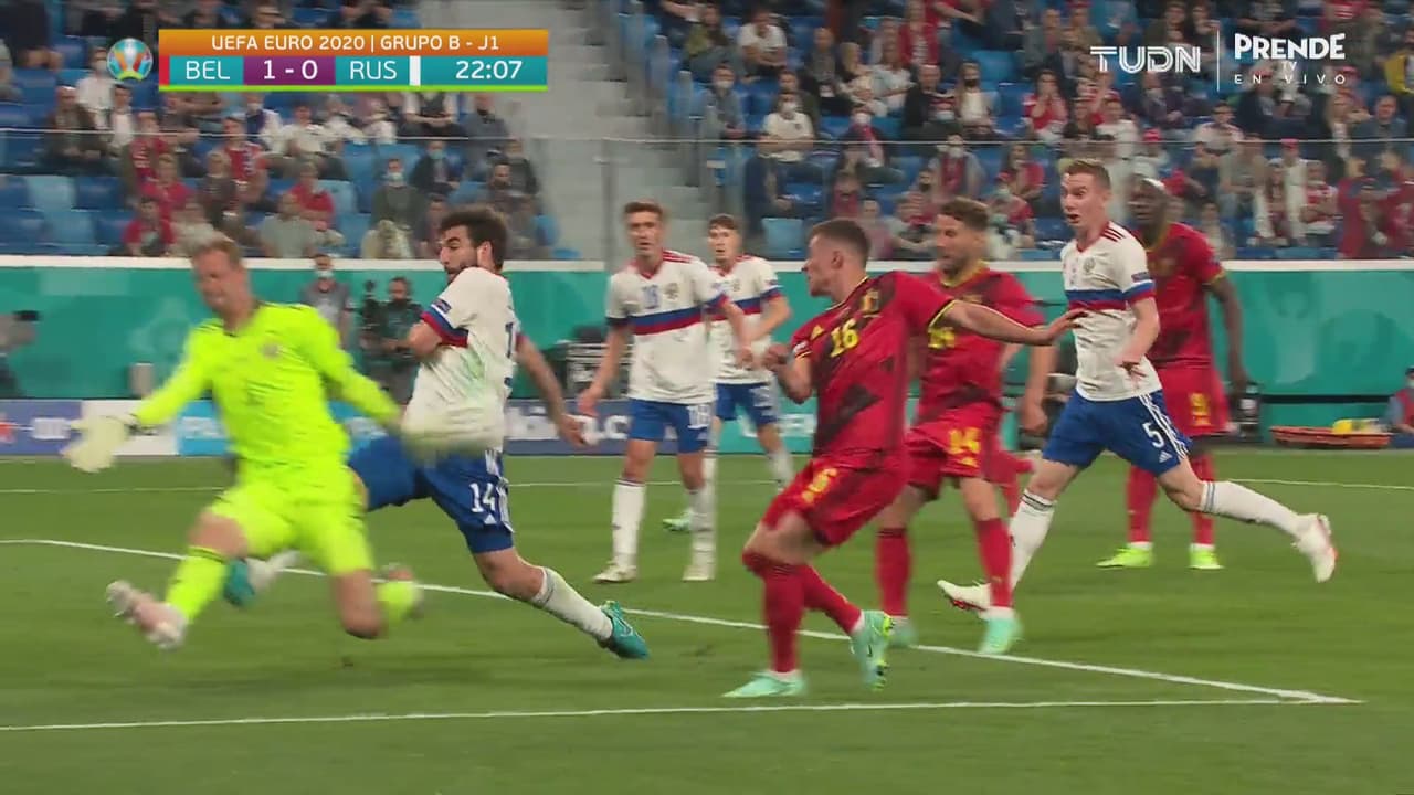 El portero sale rápido y se luce ante remate a quemarropa de Thorgan Hazard, al 21'.