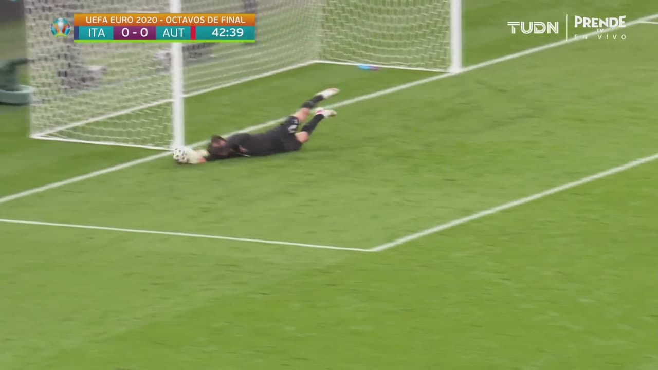 El lateral se fue arriba y mete un tiro buscando la base del poste, el portero reacciona bien, al 43'.