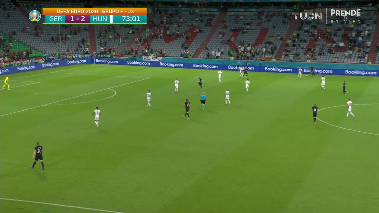 Tiro atajado. Ádám Szalai (Hungría) Disparo con la derecha desde más de 30 metros.