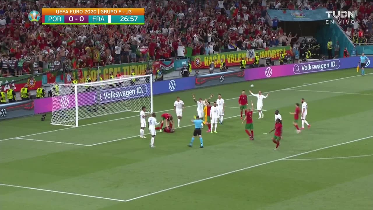 Tiro atajado. Danilo Pereira (Portugal) disparo de cabeza desde el centro del área.