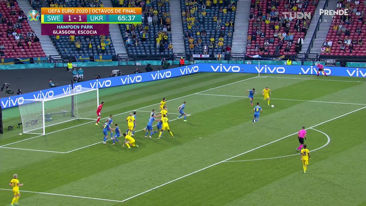 Tiro atajado al ángulo superior derecho. Dejan Kulusevski (Suecia) zurdazo desde el lado derecho dentro del área.