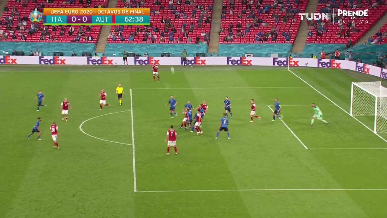 Tiro atajado junto al lado derecho de la portería. Marko Arnautovic (Austria) Disparo con la derecha desde el lado derecho dentro del área.