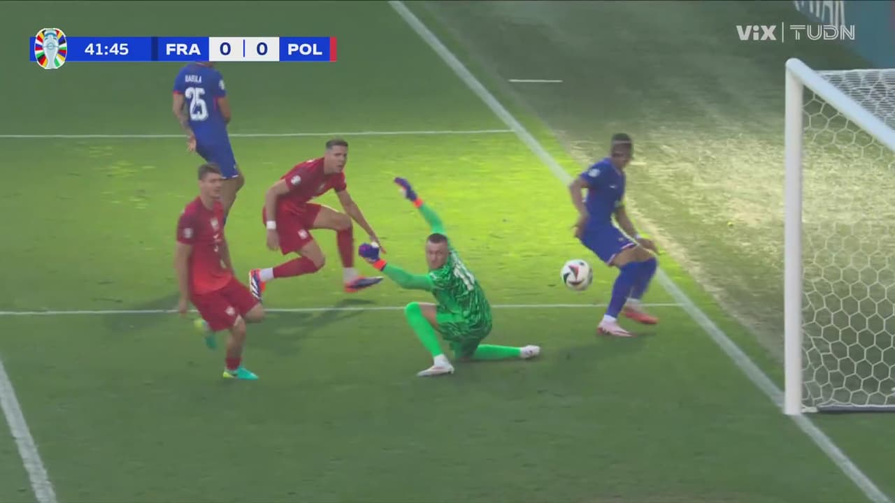 El portero de Polonia ya es factor al evitar la caída de su arco en un tiro de punterazo de Kylian en el área chica.