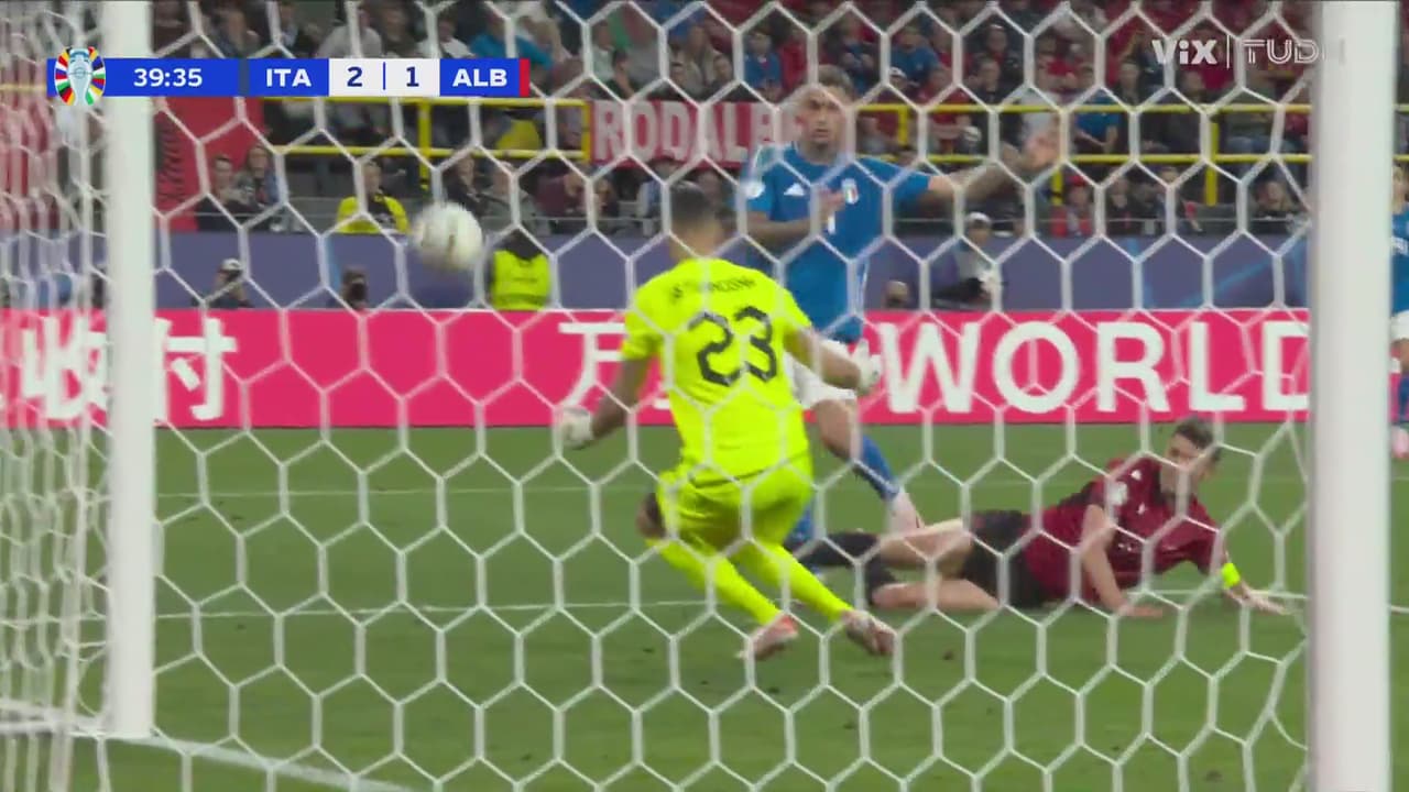El portero de Albania ya es factor para evitar una goleada con una tapada al delantero de Italia.