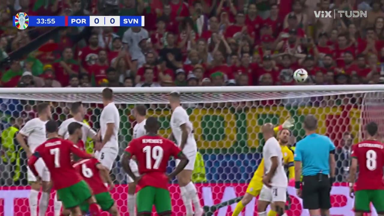 El portugués cobró un tiro libre que amenazaba el ángulo de Oblak, al final salió por encima de la escuadra y Eslovenia se salva.