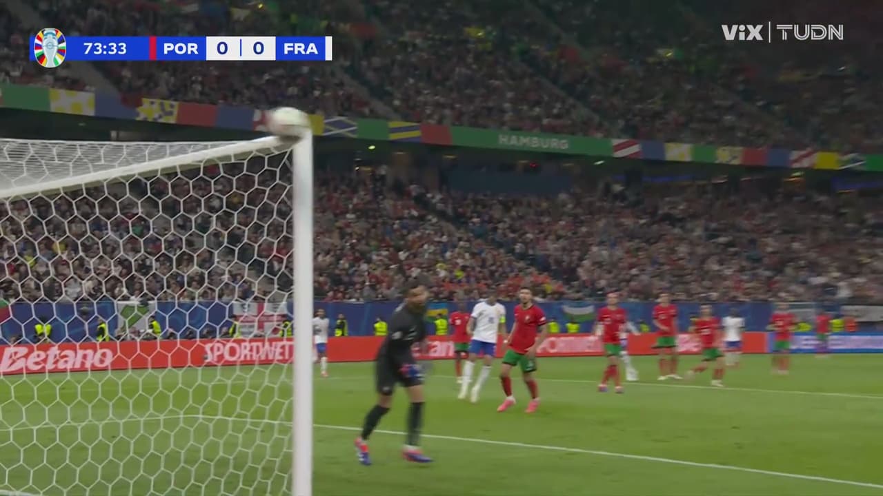 El atacante galo buscó colgarla del ángulo y la bola pasó apenas arriba de la escuadra, en otra llegada clara de Les Bleus.