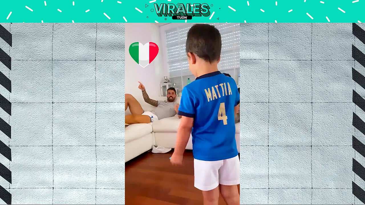 El lateral italiano, baja por lesión con La Azzurra, apoyó al equipo al entonar el himno junto a su hijo.