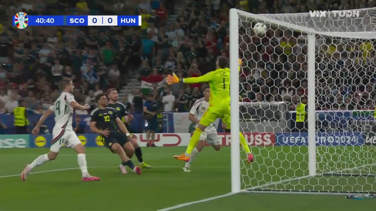 En jugada prefabricada, el defensa húngaro entra solo y remata sólido al arco de Escocia, pero el metal le impide el primero.