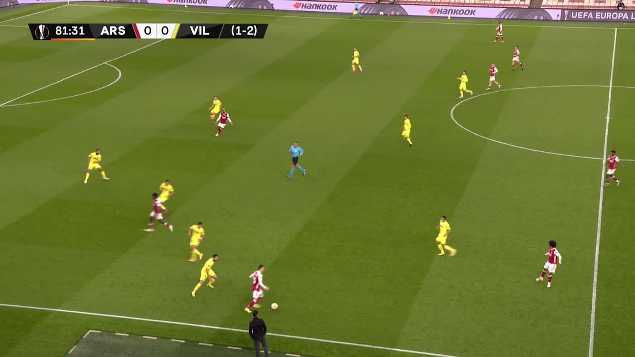 Tiro atajado al ángulo superior derecho. Gerard Moreno (Villarreal) disparo de cabeza desde el centro del área. Asistencia de Daniel Parejo con un centro al área.