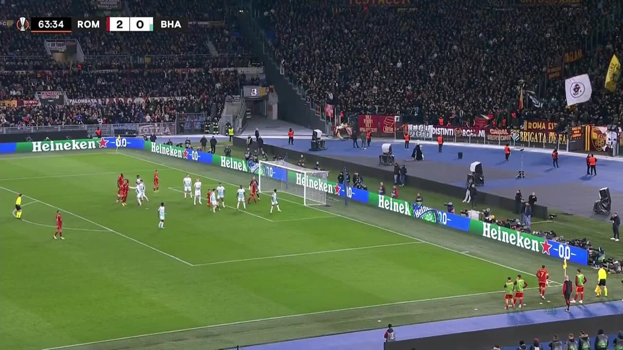 ¡Gol! AS Roma 3| Brighton and Hove Albion 0. Gianluca Mancini (AS Roma) Disparo con la derecha desde muy cerca tras un saque de esquina.