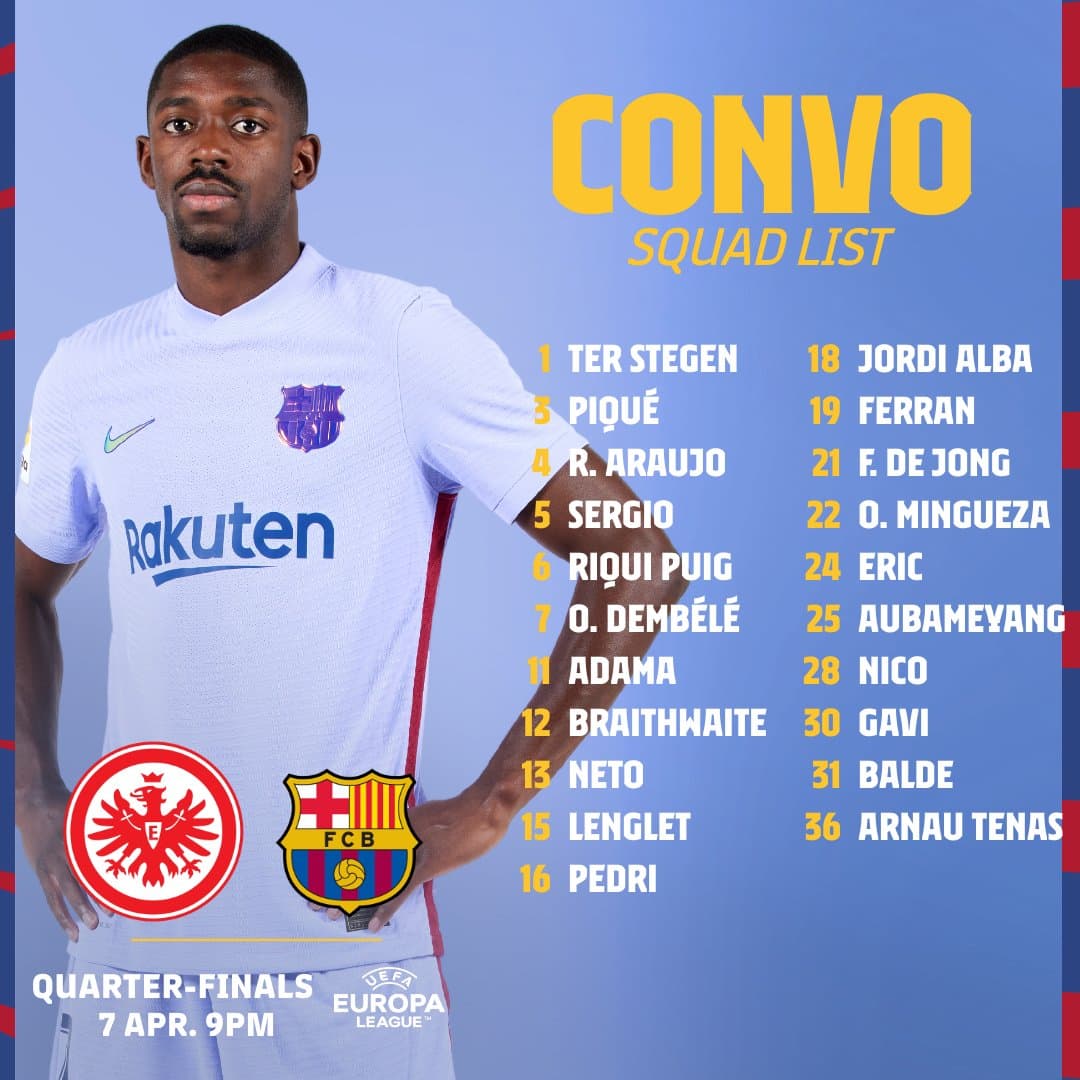 Memphis Depay, delantero del Barcelona, es baja de última hora, para el partido de ida de los Cuartos de Final de la UEFA Europa League que su equipo disputará este jueves ante Eintracht Frankfurt, a causa de una sobrecarga en el semimembranoso del muslo izquierdo.