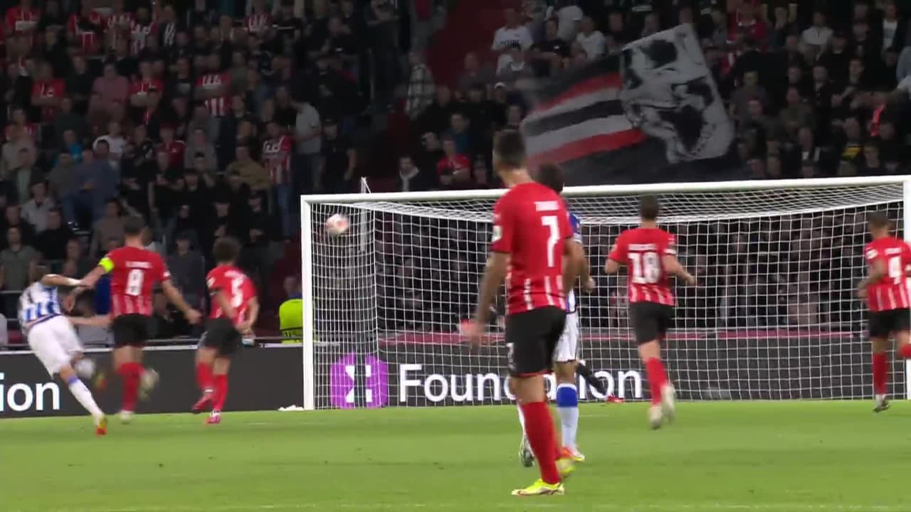Adnan Januzaj (Real Sociedad) remata al larguero| remate con la izquierda desde fuera del área. Asistencia de Joseba Zaldua.