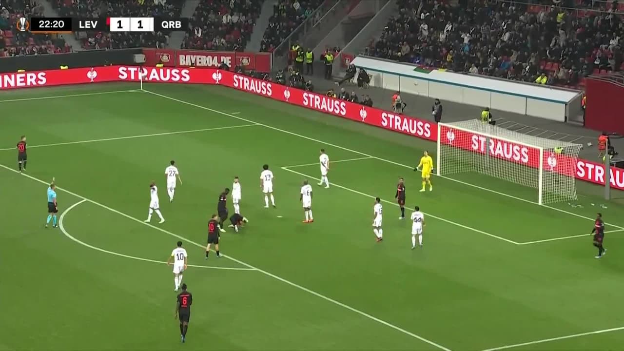 Amine Adli (Bayer 04 Leverkusen) remata al travesaño| Disparo con la derecha desde el centro del área. Asistencia de Nathan Tella con un centro al área.