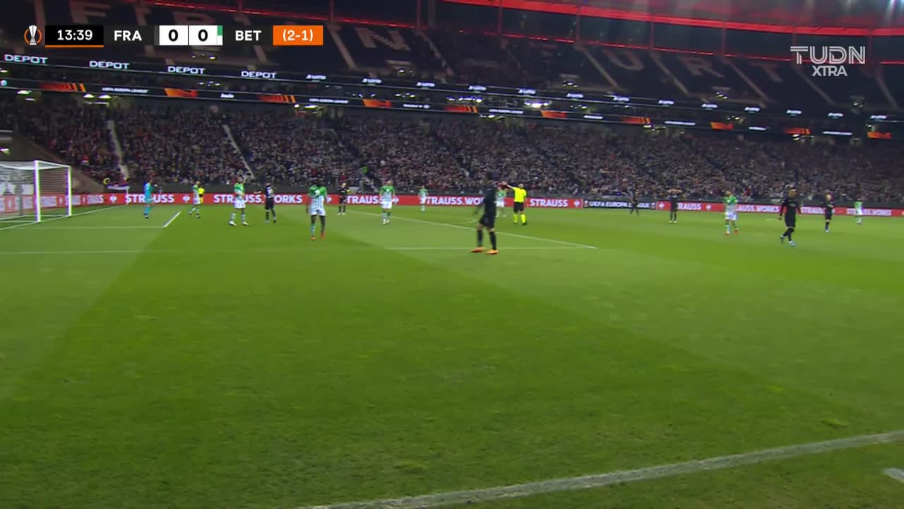 Ansgar Knauff (Eintracht Frankfurt) remata al travesaño| Disparo con la derecha desde el centro del área. Asistencia de Djibril Sow después de un pase en profundidad.
