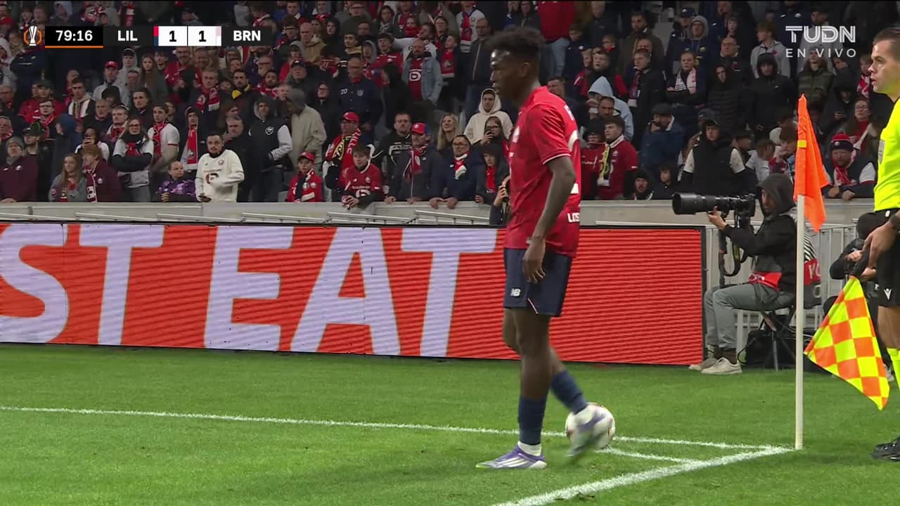 Ayyoub Bouaddi (Lille) remata al travesaño| Disparo con la derecha desde el centro del área tras un saque de esquina.