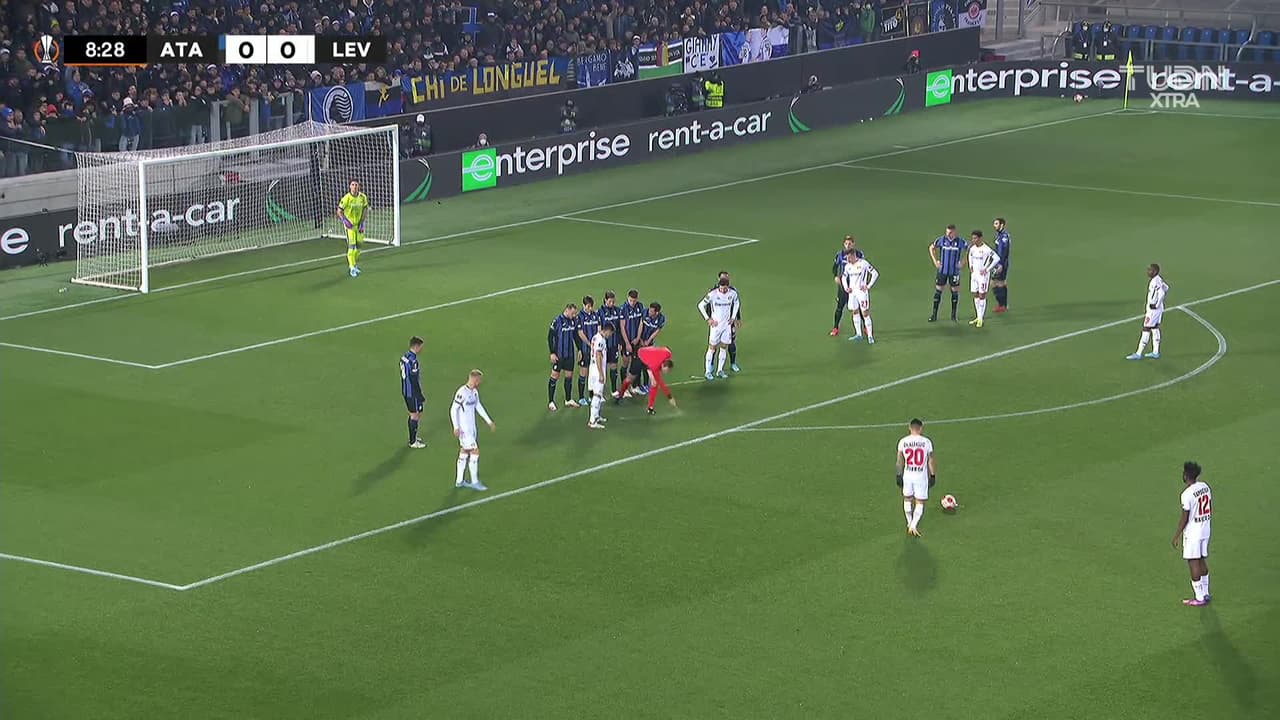 Charles Aránguiz (Bayer 04 Leverkusen) remata al poste izquierdo| Disparo con la derecha desde fuera del área de tiro libre directo.