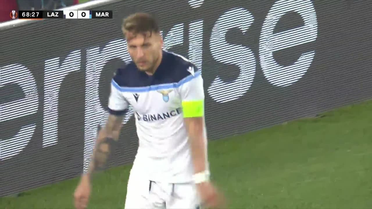 Ciro Immobile (Lazio) remata al poste derecho| Disparo con la derecha sin ángulo desde la derecha.