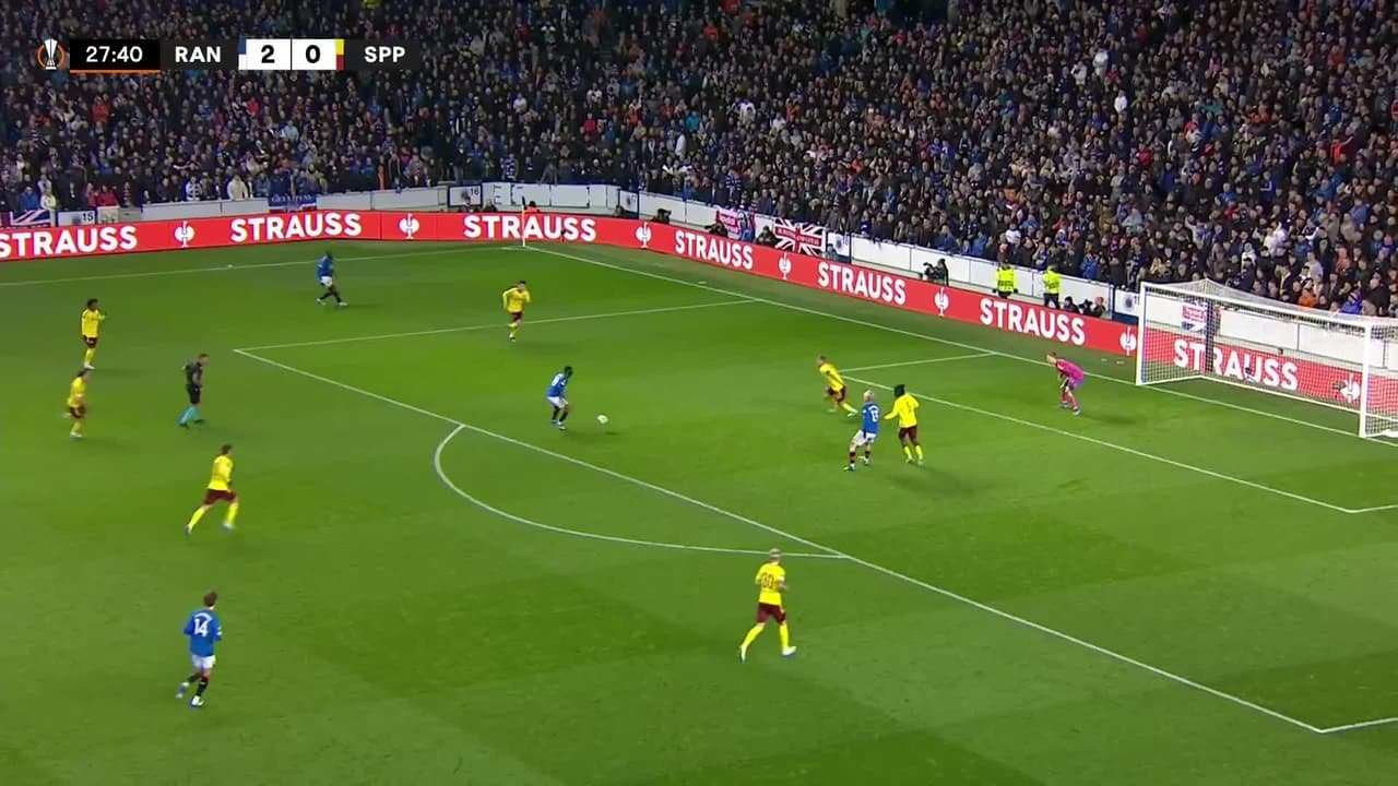 Danilo (Rangers) remata palo| Disparo con la derecha desde el centro del área.
