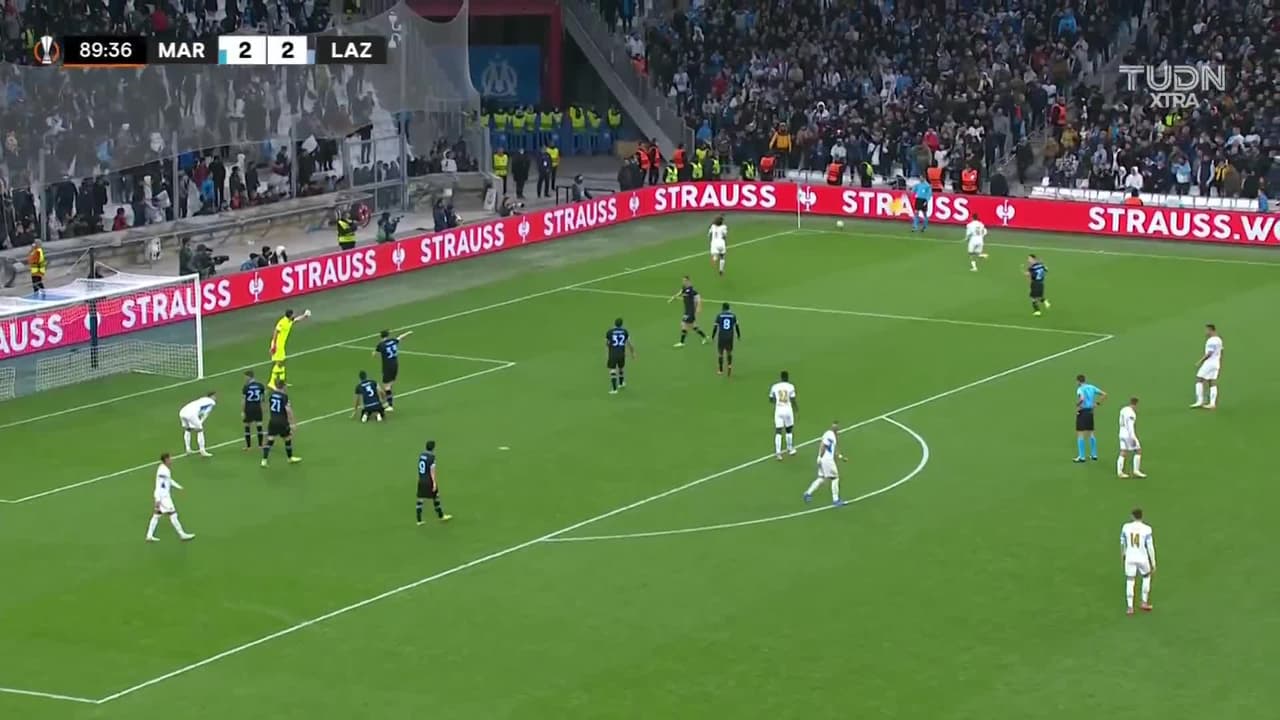 Dimitri Payet (Marseille) remata al travesaño| Disparo con la derecha desde fuera del área. Asistencia de William Saliba.
