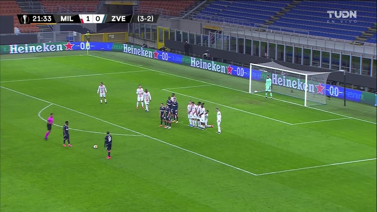 El Fardou Mohamed Ben Nabouhane (Estrella Roja de Belgrado) remata al travesaño| zurdazo desde fuera del área de tiro libre directo.